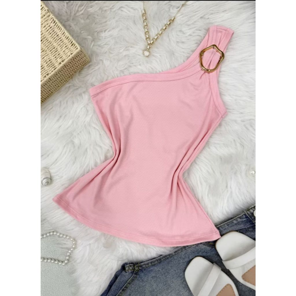 Blusa Regata Feminina Assimétrica Nula Manca Com Argola Dourada em Tecido Ribana Moda Social