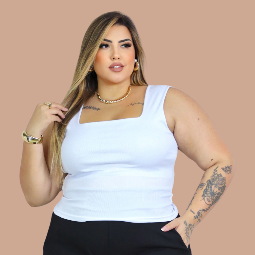 Blusa Regata Plus Size Social Chique com Gola Quadrada Verão Moda Feminina Plus Size Blusinha Lisa Ribana Canelada Forro