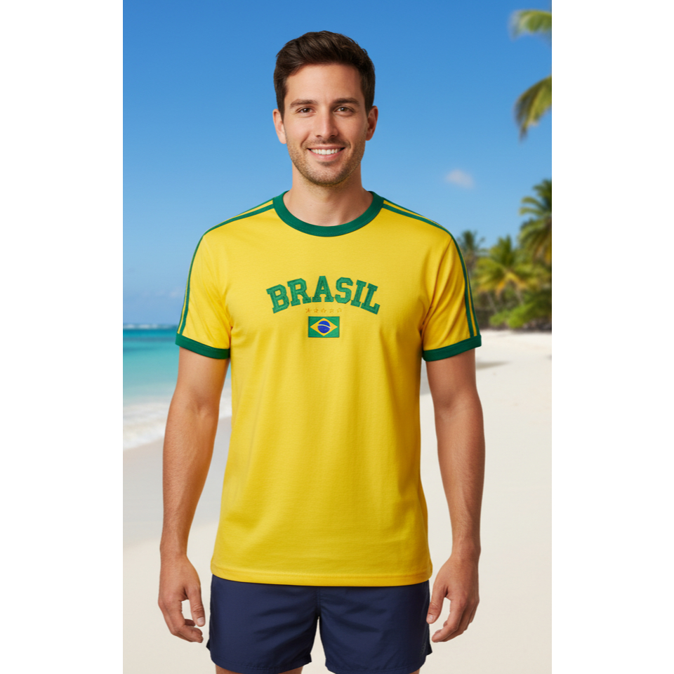 Camisa Bordada BRASIL + Bandeira – Sem Estado | Masculina - Duas Listras no ombro. Camiseta com bordado de alta qualidade, perfeita para quem quer vestir o Brasil com estilo. Produzida em algodão premium, oferece conforto, durabilidade e ótimo caimento para o dia a dia. - *Somos o único com esse modelo e essa qualidade. O resto é imitação usando as nossas fotos. ✔ Também disponível na versão feminina. Busque em nossa loja por “Camiseta Regular Feminina” para encontrar o modelo correspondente. 👕 Referência do Modelo (Vídeo) Modelo veste tamanho (G) - As medidas são um pouco menor que o padrão. Altura: 1,80m | Peso: 70kg 📏 Guia de Tamanhos – Modelagem Masculina (com Manga) PP: 62 cm (altura) x 48 cm (largura) | Manga: 17 cm P: 64 cm (altura) x 50 cm (largura) | Manga: 18 cm M: 68 cm (altura) x 51 cm (largura) | Manga: 20 cm G: 72 cm (altura) x 56 cm (largura) | Manga: 21 cm GG: 76 cm (altura) x 60 cm (largura) | Manga: 22 cm EXG: 80 cm (altura) x 65 cm (largura) | Manga: 23 cm 📌 Importante: Recomendamos comparar as medidas com uma camiseta que você já possui para escolher o tamanho ideal. ⚠️ Observação: Não realizamos alterações no bordado ou no modelo das camisas. 🧵 Material Confeccionada em algodão de alta qualidade, proporcionando: ✔ Conforto durante todo o dia ✔ Excelente respirabilidade ✔ Maior durabilidade do tecido e do bordado 🧼 Instruções de Lavagem (Para preservar o bordado e evitar manchas) 1️⃣ Preparo: Encha uma bacia com água fria ou morna. 2️⃣ Sabão: Utilize uma pequena quantidade de sabão líquido suave. 3️⃣ Lavagem: Esfregue delicadamente apenas nas áreas necessárias (gola e axilas). 4️⃣ Enxágue: Enxágue bem até remover completamente o sabão. 5️⃣ Secagem: Pressione levemente para retirar o excesso de água sem torcer e seque à sombra. ✔ Seguindo essas recomendações, sua camisa permanecerá bonita e conservada por muito mais tempo.