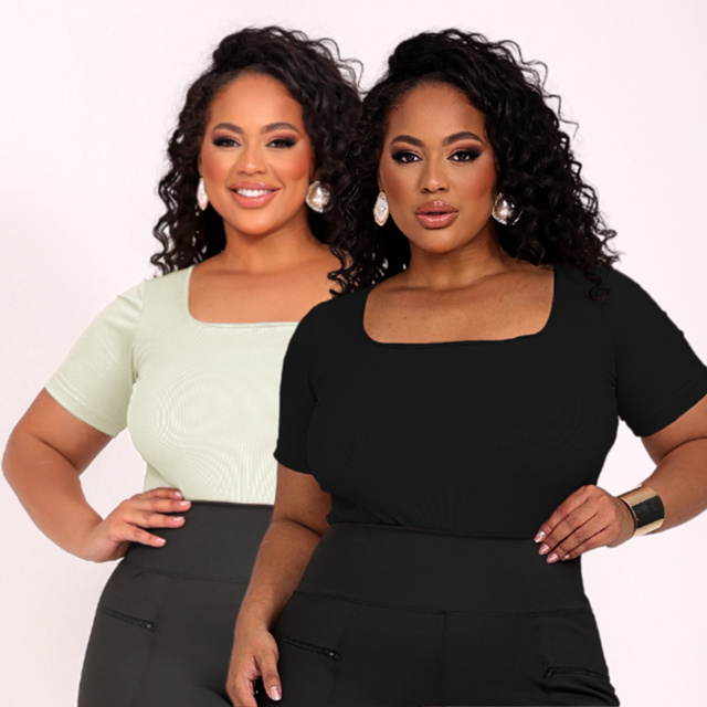 Blusa Ribana Canelada Manga Curta Gola Quadrada Tendência Elegante Casual Dia a Dia Lisa GG ao G4