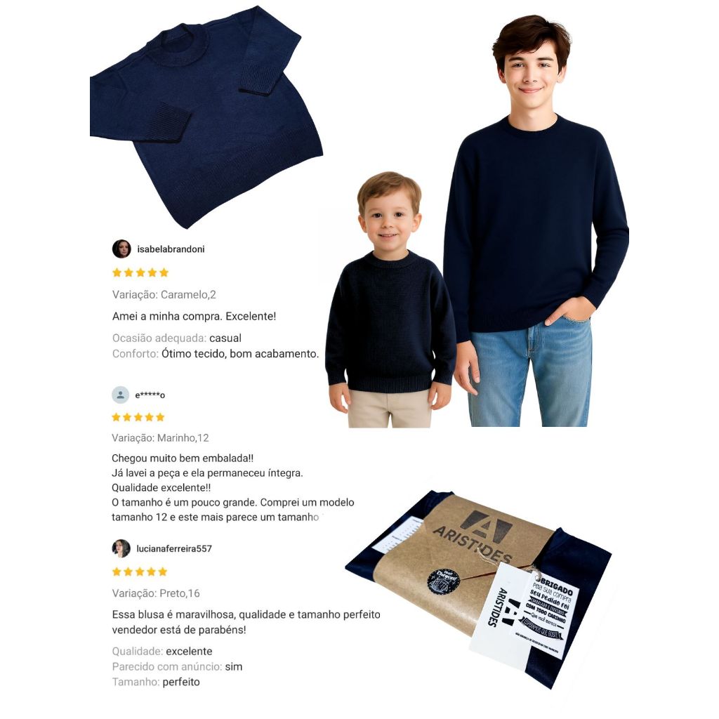 SEJA BEM VINDO A NOSSA LOJA. Produto a pronta entrega, o pedido será postado até 24H após o pedido estar confirmado. *Fabricamos peças Infantis e para Adolescentes. Suéter gola redonda de malha tricô com ombro francês tem modelagem contemporânea urbana. Confeccionado em tricô com Fio 100% ACRÍLICO que traz uma TEXTURA LEVE, QUENTE, CONFORTÁVEL e AUTÊNTICO com CAIMENTO AJUSTADO ao corpo, a peça de mangas longas possui acabamento canelado no decote redondo, nos punhos e na barra. Estiloso para qualquer ambiente. Infantojuvenil masculino. tamanhos: 2 ao 16 OBS: tamanho 16 veste como tam: P Adulto. OBS: tamanho 14 vaste como tam: PP Adulto. *Peças de malha tricô. Fio 100% ACRÍLICO. *Zelamos pela qualidade e entrega. >medidas do tamanho 16. manga 59cm, comprimento do corpo 67cm, ombro a ombro 43cm. >medidas do tamanho 14. manga 56cm, comprimento do corpo 63cm, ombro a ombro 42cm. >medidas do tamanho 12. manga 54cm, comprimento do corpo 57cm, ombro a ombro 39cm. >medidas do tamanho 10. manga 54cm, comprimento do corpo 56cm, ombro a ombro 39cm. >medidas do tamanho 8. manga 50cm, comprimento do corpo 53cm, ambro a ombro 38cm. >medidas do tamanho 6. manga 46cm, comprimento do corpo 49cm, ombro a ombro 36cm. > medidas do tamanho 4. manga 34cm, comprimento do corpo 46cm, ombro a ombro 33cm. >medidas do tamanho 2. manga 28cm, comprimento do corpo 37cm, ombro a ombro 30cm. somos: Aristides. Peças > PREMIUM. #Luxo silencioso.