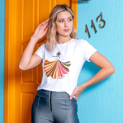 Blusa T-shirt Camiseta Feminina Estampada - Bailarina - Branca