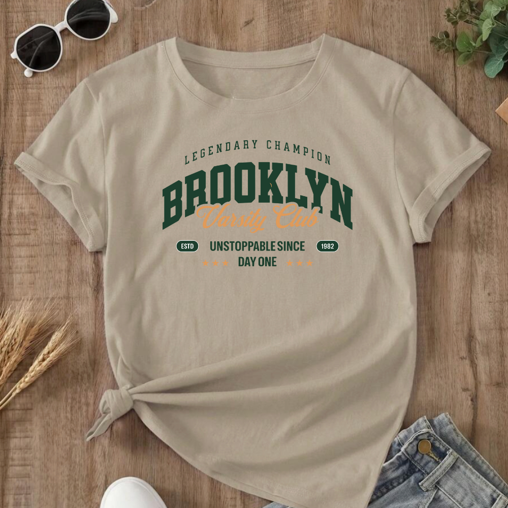 Blusa T Shirt Feminina estampa Brooklyn Varsity Estampada 100% Algodão ✅Sobre o produto: ✔ Tecido premium 100% algodão ✔ Estampas em alta qualidade ✔ Costura reforçada, não desbota e não encolhe ✅Diferencial do nosso produto: ✔ Tecido macio e confortável ✔ Não da bolinhas após lavagem e não fica transparente ✔ Ideal para usar no dia a dia, agregando conforto e leveza para um look muito despojado. ⚠️ Na compra do kit mandar a cor de sua escolha no chat após a compra. Trabalhamos com envios imediatos pela transportadora. 🚚 Envio Super Rápido 🥰 Para dúvidas, estamos à disposição no chat