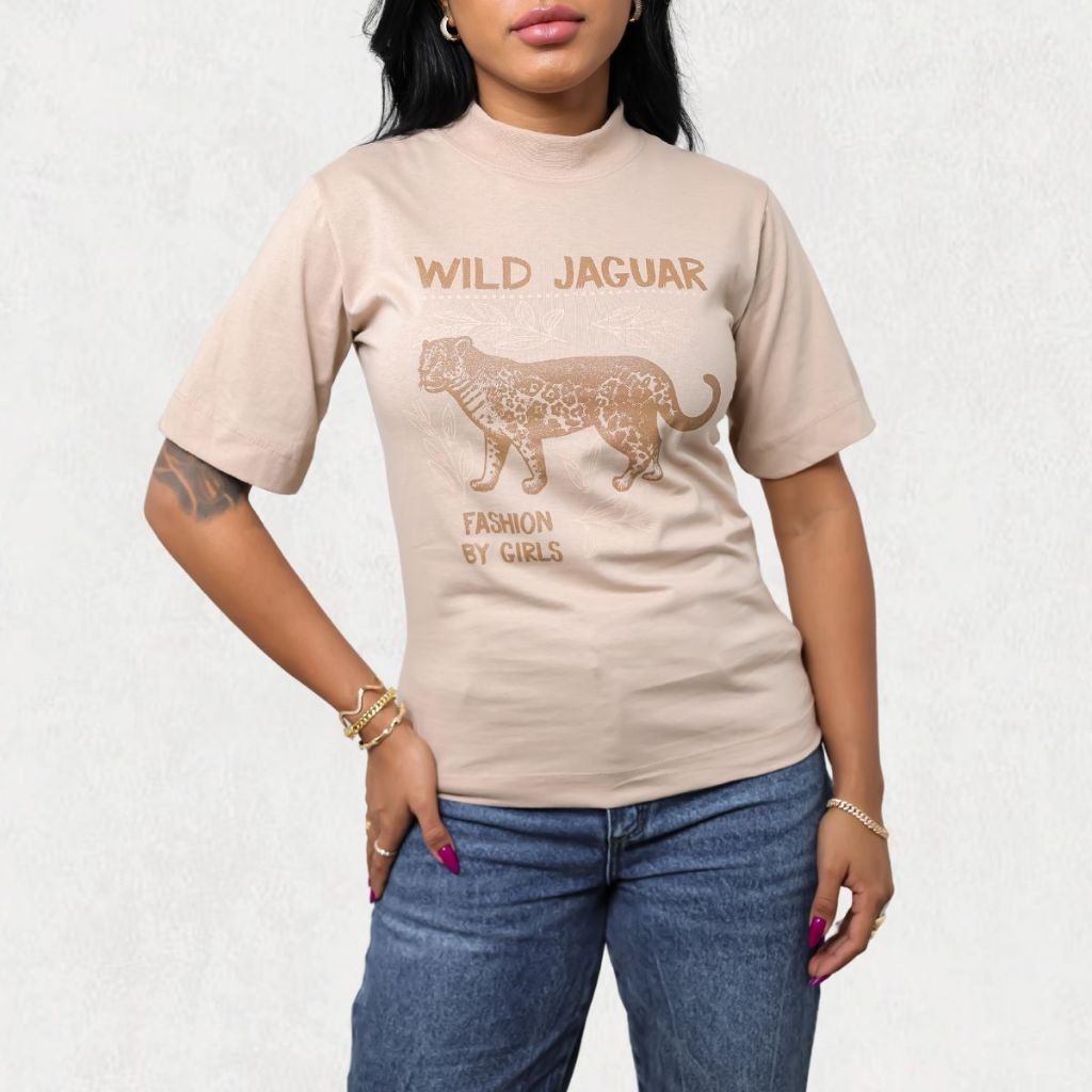 Blusa T-Shirt Gola Alta Feminino Estampado Jaguar 100% Algodão