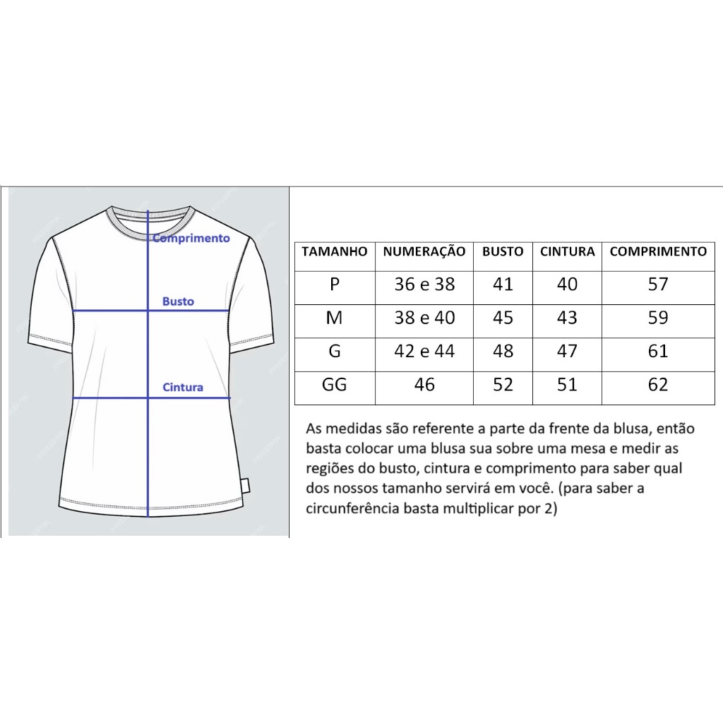 -Tecido Viscopoly é um tecido premium, uma combinação de Poliéster com Elastano que traz elasticidade, maciez e conforto ao vestir. -Acabamentos com Ribana e Manguinha de Tule proporcionando qualidade premium de fabricação. -Tecnologias: Anti-piling (Não da Bolinhas), Dry (Absorção de Suor) e Selo de Fabricação Sustentável. As artes são sublimadas com produtos importados de alta qualidade, garantindo cores vivas e ótima qualidade de imagens. Envio Rápido: Enviamos com até 2 dias úteis. Para saber o prazo de chegada basta simular uma compra. Compra Segura: Toda compra é segurada e caso não goste, pode ser feita a devolução com até 7 dias úteis sem custo algum. Tabela de Medidas: As medidas são referente a parte da frente da blusa, então basta colocar uma blusa sua sobre uma mesa e medir as regiões do busto, cintura e comprimento para saber qual dos nossos tamanho servirá em você. (para saber a circunferência basta multiplicar por 2). P - veste 36 e 38 - Busto 41, Cintura 40, Comprimento 57 cm. M - veste 38 e 40 - Busto 45, Cintura 43, Comprimento 59 cm. G - veste 42 e 44 - Busto 48, Cintura 47, Comprimento 61 cm. GG- veste 46 - Busto 52, Cintura 51, Comprimento 62 cm. Qualquer dúvida pode nos chamar no chat, será um prazer te atender!