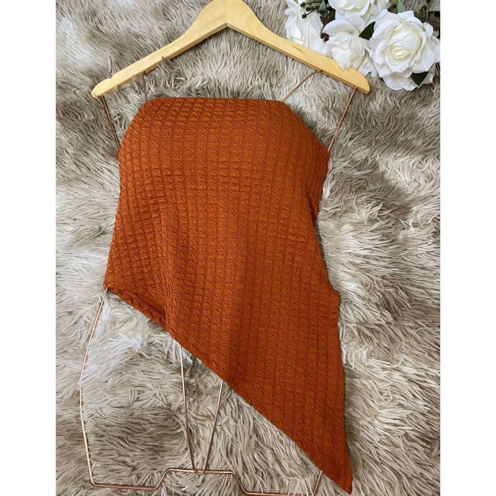 Blusa Tomara que Caia Assimétrica Bubble O Ponto Alto da Moda Moderna Cropped Com Bojo em Anarruga Assimetrica Ribana