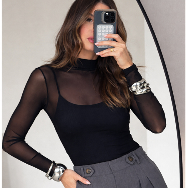 Blusa Tule Fenenina Gola Alta Manga Longa Transparente Tamanhos M,G, Fit Justo