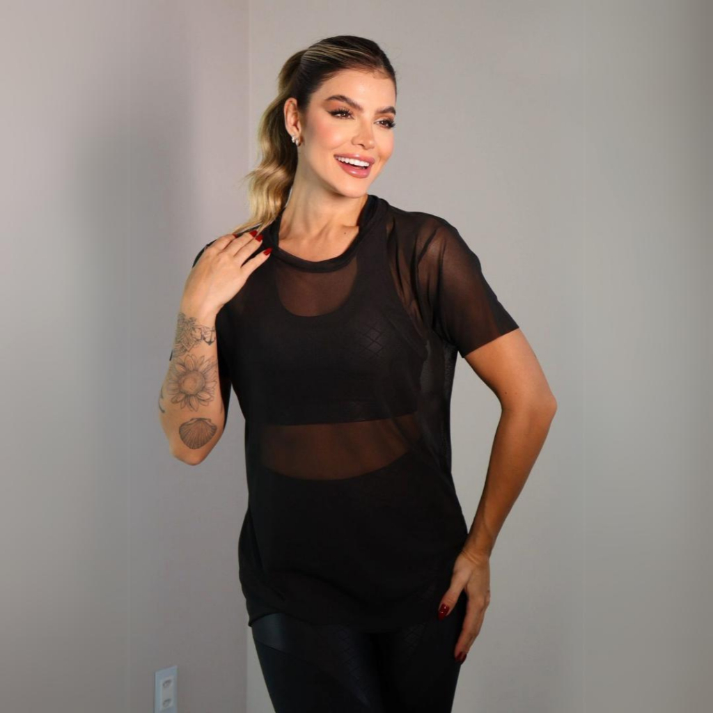 Blusa Tule Transparente Feminina Academia Fitness Manga Longa Camisão CVL