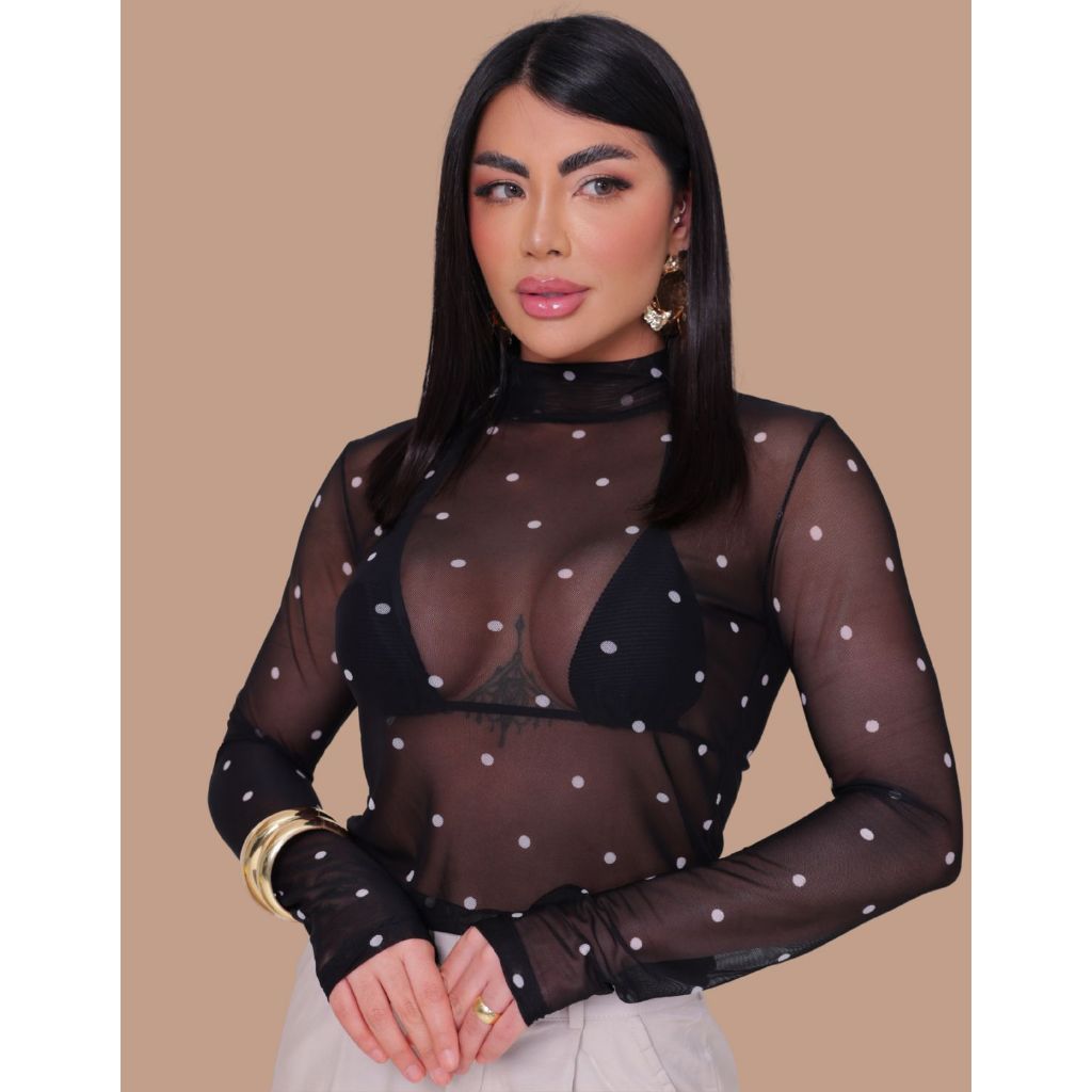 Blusa Tule Transparente Segunda Pele Alta Poá Bolinhas Segunda Pele Sexy Elegante