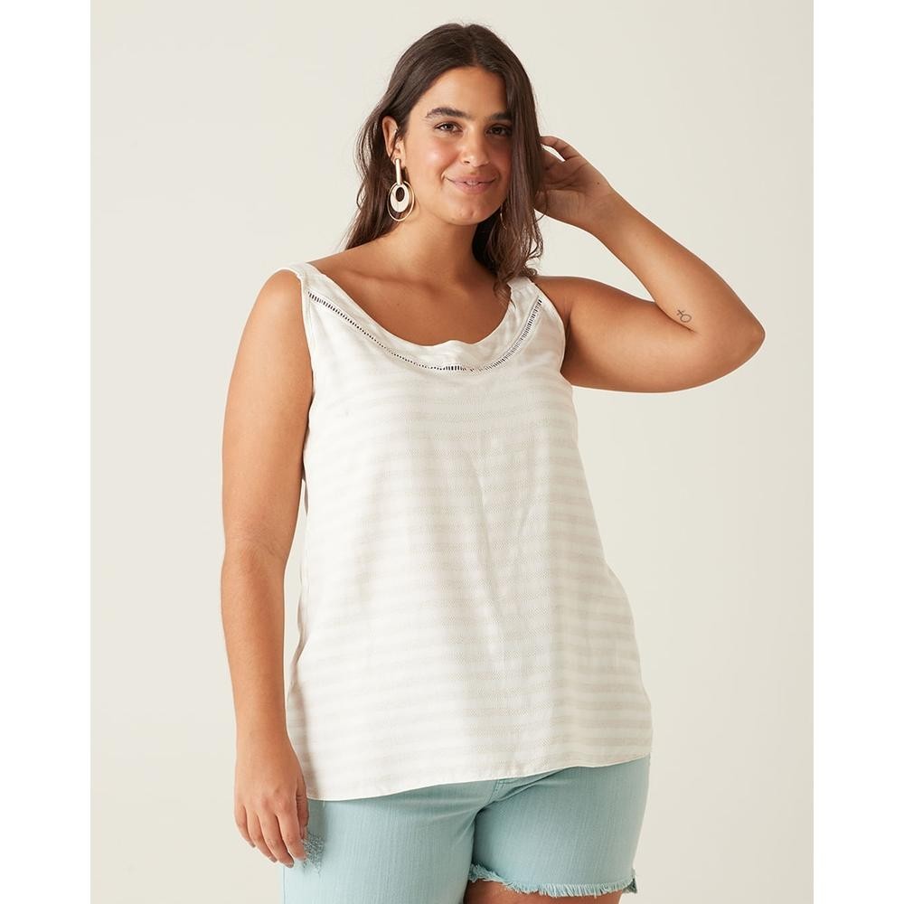 Blusa confeccionada em viscose fio tinto maquinetado e tecido fio tinto flamê rustic. Modelo possui decote redondo, alças médias e detalhe de vazado frontal. Estampa de listras. Uma peça de caimento leve e ideal para aproveitar os dias mais quentes. Combine com short jeans e sandália rasteira, para um visual descontraído. Decote: Redondo Alças: Médias