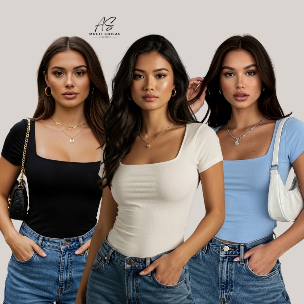 Blusinha baby look kit com 3 dia a dia e casual escola faculdade tecido suplex