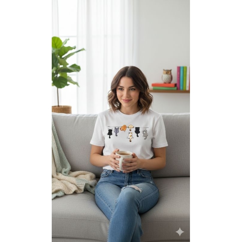 Blusinha Camisa Baby look 100% Algodão Estampa Varal de Gatinhos Casual Delicado