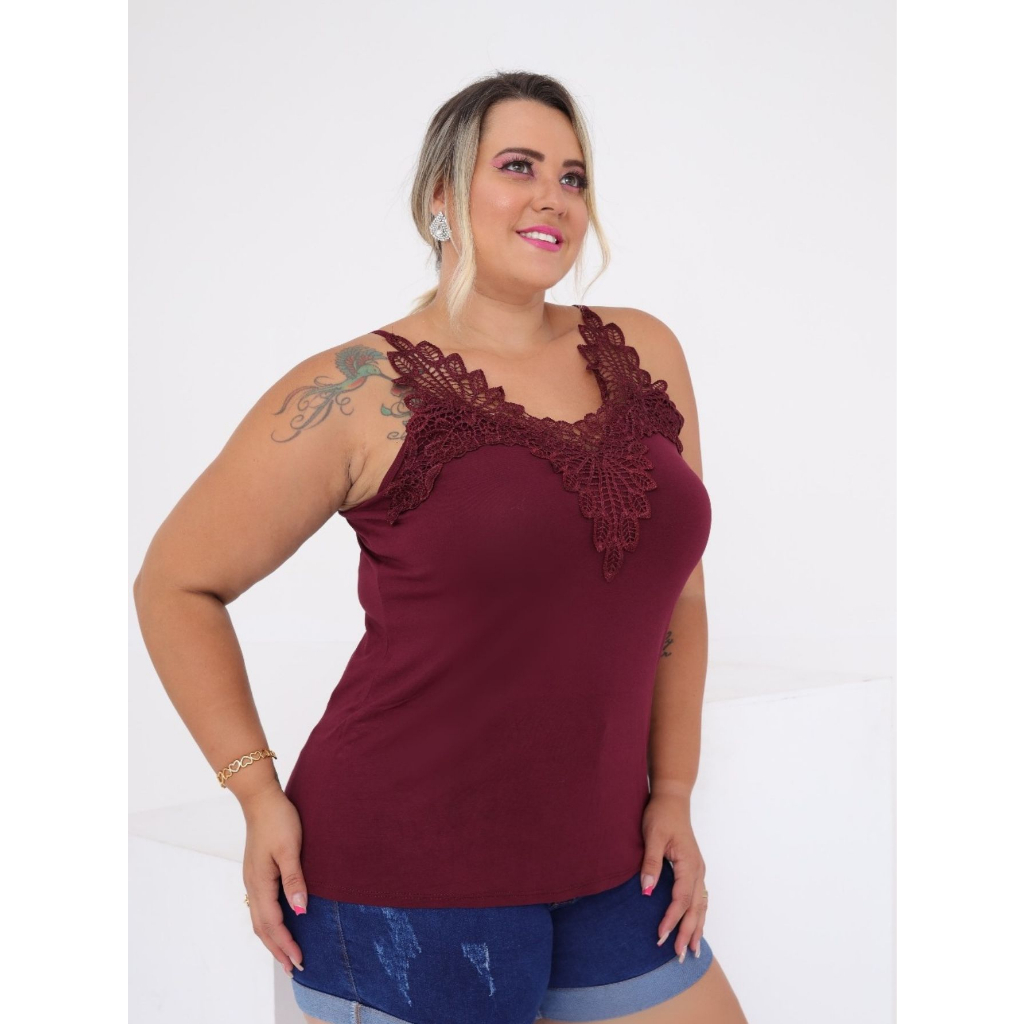 Blusinha Plus Size Regatinha Feminina Com Alça Fina e Gola Rendada