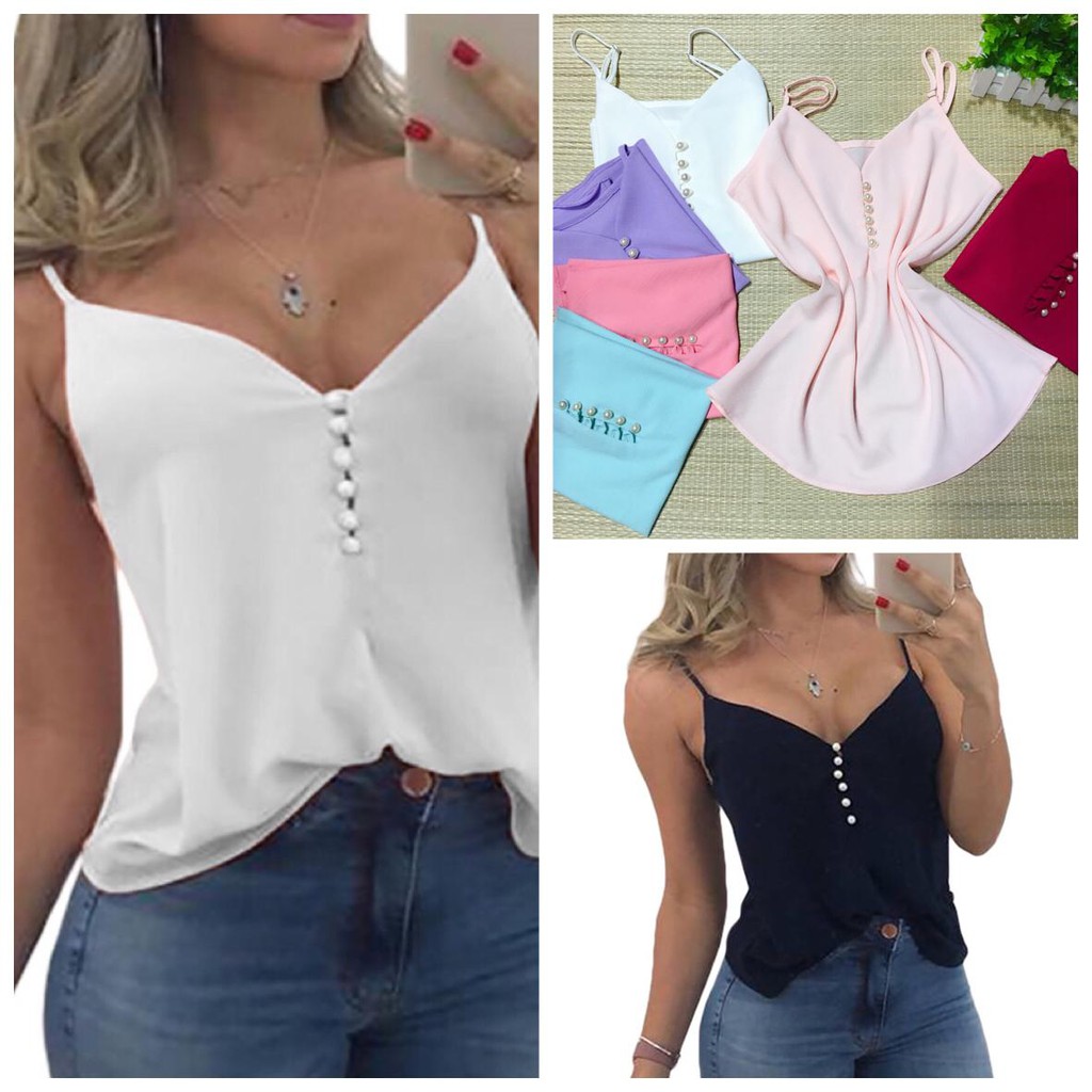 Blusinha Regata Crepe Malha Pedraria Botão Com Alça Fina Modelo Verão Feminina
