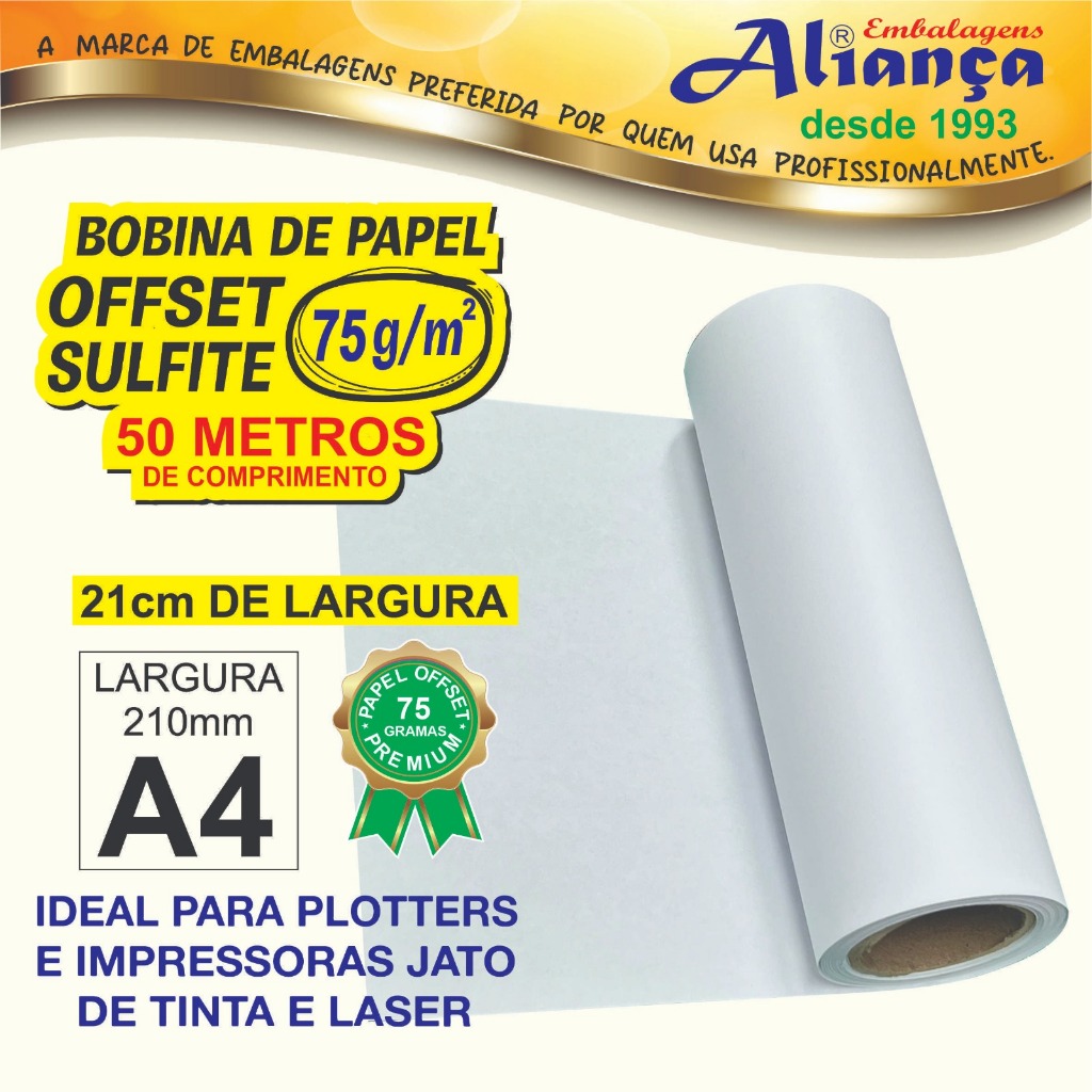 Bobina de Papel Sulfite/Offset A4 210mm A Bobina de Papel Sulfite Offset A4 (210mm) é perfeita para quem busca qualidade, praticidade e versatilidade na impressão ou na produção gráfica. Produzida com papel branco liso e de alta brancura, garante ótima definição e nitidez nas impressões, cortes e acabamentos. Tipo: Papel Sulfite / Offset branco Formato: A4 – Largura 210mm Embalagem: Bobina / rolo contínuo Cor: Branco de alta brancura Gramatura: padrão offset (ideal para impressão e corte) Compatível com: impressoras offset, copiadoras, plotters e equipamentos de corte Tubete interno de 2 polegadas (padrão para plotter) Excelente qualidade de impressão e reprodução de cores Superfície lisa e uniforme para melhor desempenho Ideal para gráficas, escolas, escritórios e artesanato Pode ser utilizada em impressões, embalagens, blocos, formulários, artes e personalizações Aplicações: Perfeita para uso em gráficas, papelarias, empresas de comunicação visual, escolas, birôs de impressão, escritórios e empreendedores que buscam um papel de qualidade para produção em volume. Dica: Por ser em bobina, você pode ajustar o comprimento conforme a necessidade, evitando desperdícios e otimizando a produção.