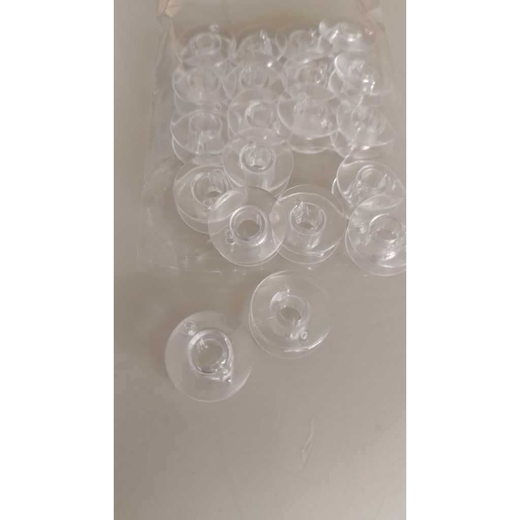 Kit com 20 un bobinas plásticas alta. USO: Máquinas de costura domésticas Tamanho total : 1,1cm de altura x 2cm de diâmetro Material: Plástico Transparente. Esta Bobina Serve em Todas as Máquinas da ELGIN, JANOME E BROTHER.