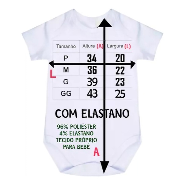 Body em Malha poliéster com elastano na cor branca. feito por Sublimação, Excelente qualidade e durabilidade, estampa não deixa relevo, pois penetra diretamente nas fibras do tecido, além de não rachar e não desbotar! MEDIDAS DO BODY COM BOTÃO FECHADO P - 34 CM ALTURA X LARGURA 20CM M - 36CM ALTURA X LARGURA 22CM G - 39 CM ALTURA X LARGURA 23 CM GG - 43 CM ALTURA X LARGURA 25 CM EM CASO DE DÚVIDA PEGAR UM BODY DO SEU BEBÊ E COMPARAR AS MEDIDAS