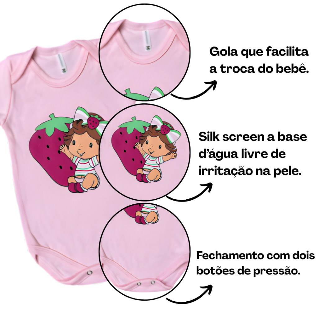 Body bebe Fantasia Mesversario Menina da Moranguinho Boneca - Suedine 100% Algodão