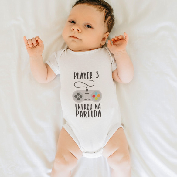 Body Bebê Manga Curta Frase Player 3 Entrou na Partida