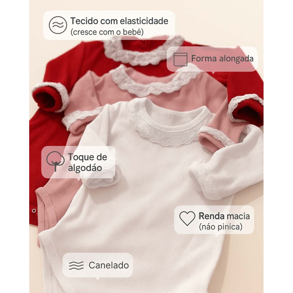 Body bebê manga longa com renda | Malha canelada charmosa e macia