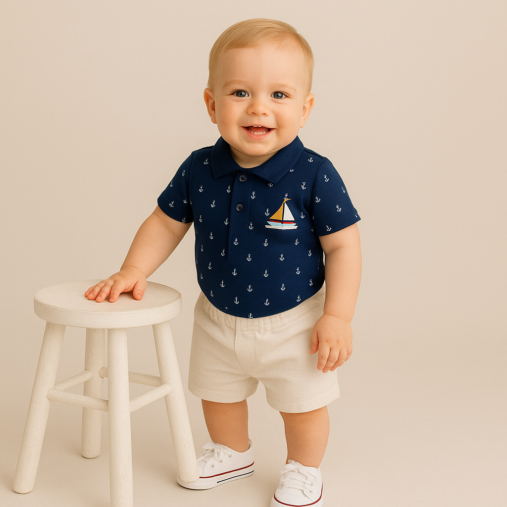 ✨ Body Polo Bebê Menino Marinheiro ✨ Body estilo polo super charmoso, confeccionado em tecido macio e confortável, ideal para deixar o bebê estiloso em qualquer ocasião. Possui estampa de âncoras e detalhe frontal com botões, trazendo praticidade e elegância. 📌 Detalhes do produto: - Modelo com gola polo e botões frontais; - Fechamento inferior em botões de pressão; - Estampa náutica com âncoras; - Alguns modelos possuem bordado de barquinho à vela; - Confortável e fácil de vestir. 👶 Indicado para bebês de diferentes idades, unindo conforto e estilo em uma única peça. - ATENÇÃO: O BORDADO PODE VARIAR 💬 Dúvidas? Pergunte! A gente responde rapidinho. 🧵Material: - Malha canelada: Azul Claro, Marinho e Branco - Pique: Cinza Mescla 🎨Opções de cores: Azul Claro, Marinho, Cinza Mescla e Branco 📏Tabela de Medidas (Altura x Largura): ✨P: 36,5cm x 20cm ✨M: 38cm x 21cm ✨G: 39,5cm x 22cm