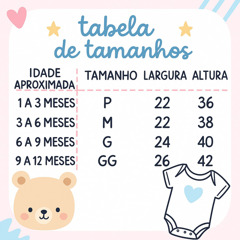 💪🏼 Body Bebê Personalizado - Nova Parceira de Treino - Poliéster + Elastano - Estica! 🍼🏋️♀️ Nova parceira de treino dos papais! Quem disse que treino pesado não pode ser cheio de amor? Agora os papais ganharam uma ajudante fofa e cheia de energia (ainda que só pra carregar no colo)! 😍 👕 Tecido de qualidade: 96% Poliéster e 4% Elastano – Estica! Confortável, macio e ideal para acompanhar cada movimento da nova "treinadora" da casa! 🩷 📏 Tamanhos disponíveis: Tamanho P: 21 x 36 cm (Indicado para bebês de 1 a 3 meses) Tamanho M: 22 x 38 cm (Indicado para bebês de 3 a 6 meses) Tamanho G: 24 x 40 cm (Indicado para bebês de 6 a 9 meses) Tamanho GG: 26 x 42 cm (Indicado para bebês de 9 a 12 meses) 🚚 Produção e envio: O prazo varia entre 1 a 5 dias úteis, dependendo da demanda. Caso tenha urgência, fale com a gente no chat antes de finalizar a compra para verificarmos se há possibilidade de envio antecipado — às vezes conseguimos sim, outras vezes não. Deixe o treino ainda mais especial com essa fofura que vai conquistar o coração (e o colinho) dos papais marombeiros! 💖🏋️♂️