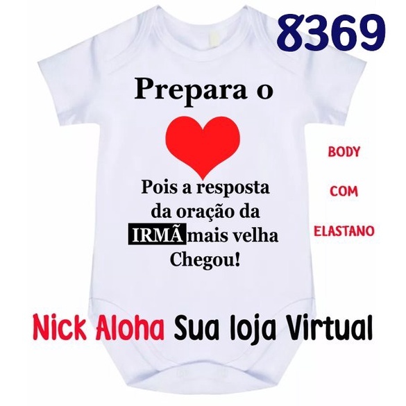 | BODY BEBÊ PREPARA O CORAÇÃO POIS A RESPOSTA DA ORAÇÃO DA IRMÃ MAIS ... este produto | R$ 26,00 | — | 4.9/5 | 4 |