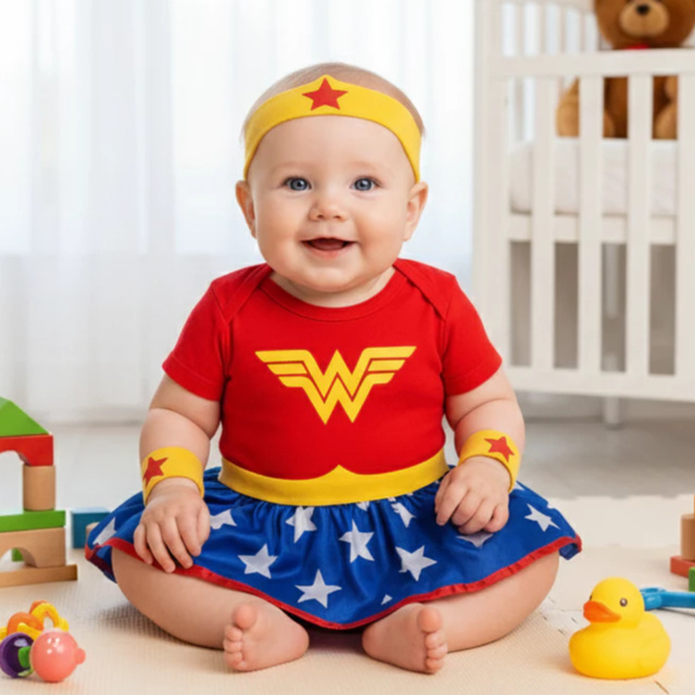 Body Bebe Temático Mêsversario Fantasia da Mulher Maravilha - Suedine 100% Algodão