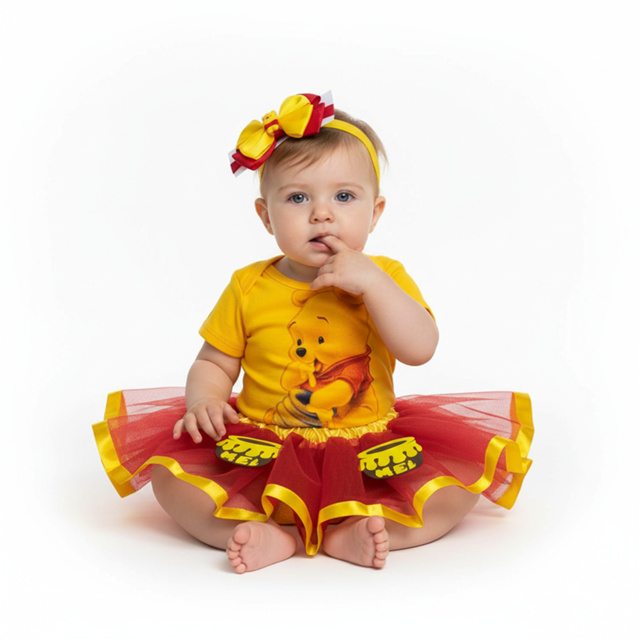 Body Bebê Ursinho Pooh + Laço + Saia Tutu - Mesversário Temáticos