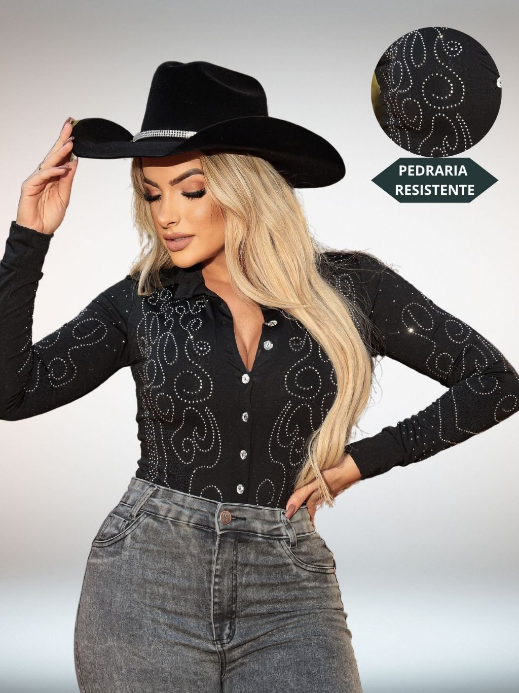 Body Brilho Country Tecido Não Transparente Pedraria strass com Botão Brilhante Rodeio