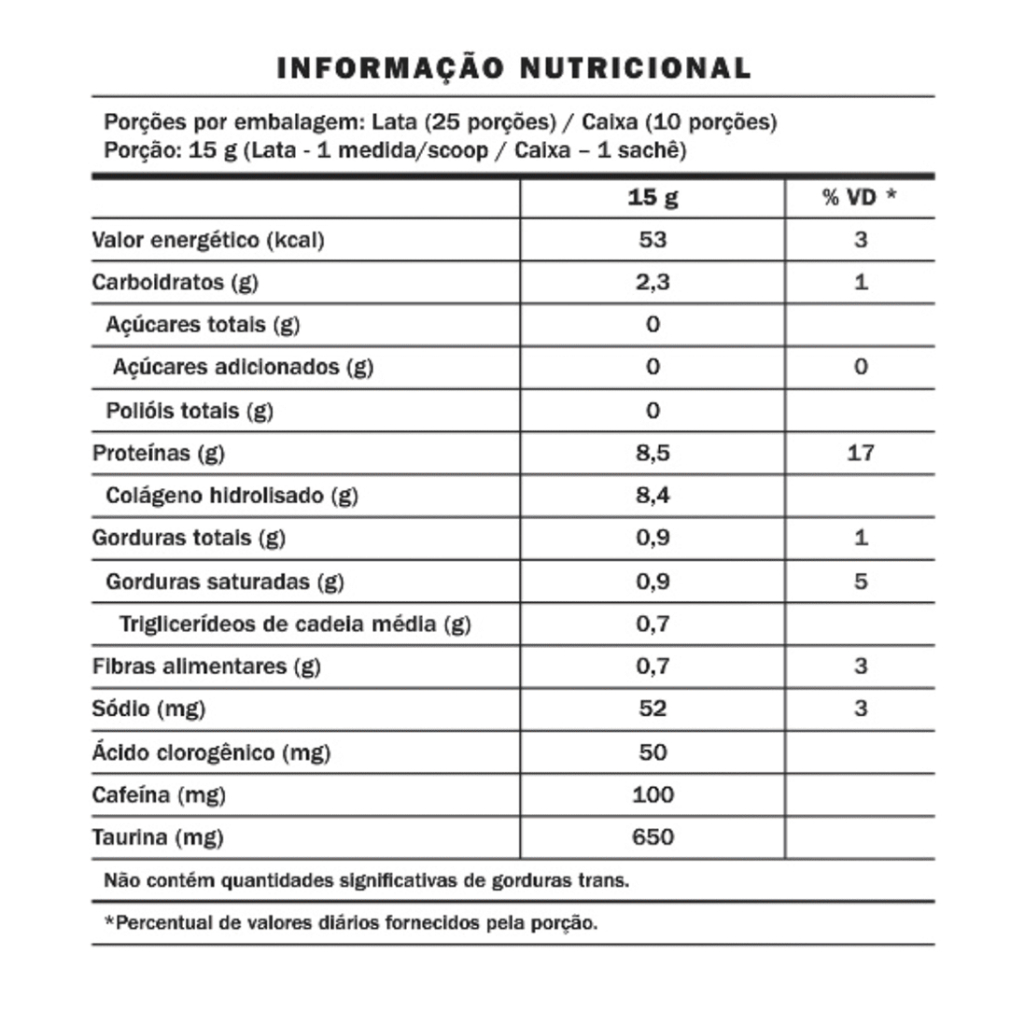 PROMOÇÃO LIMPA ESTOQUE! Suplemento alimentar em pó que combina café solúvel, cafeína microencapsulada e proteína de colágeno hidrolisado, desenvolvido para complementar a ingestão de proteínas e oferecer energia para a rotina diária. Sua fórmula reúne triglicerídeos de cadeia média (TCM), taurina e especiarias como cúrcuma, pimenta-preta e canela, além de sabor Vanilla com notas de avelã. Embalagem com 375g. Rende aproximadamente 25 porções. Modo de uso: Consumir 15 g (1 medida/scoop) ao dia, 30 minutos antes da atividade física ou cognitiva, ou conforme orientação de profissional habilitado. Pode ser utilizado antes e/ou depois do treino. Uso adulto. Ingredientes: Colágeno hidrolisado, triglicerídeos de cadeia média (TCM), café solúvel, taurina, café verde moído, canela, cafeína microencapsulada, cardamomo, cúrcuma, pimenta-preta, aromas idênticos aos naturais (baunilha, avelã e leite), goma arábica, goma xantana, dióxido de silício, bicarbonato de sódio, glicosídeos de esteviol e taumatina. Informações adicionais: Não contém glúten. Alérgicos: pode conter derivados de soja e leite. Este produto não é um medicamento. Não exceder a recomendação diária indicada na embalagem. Manter fora do alcance de crianças.