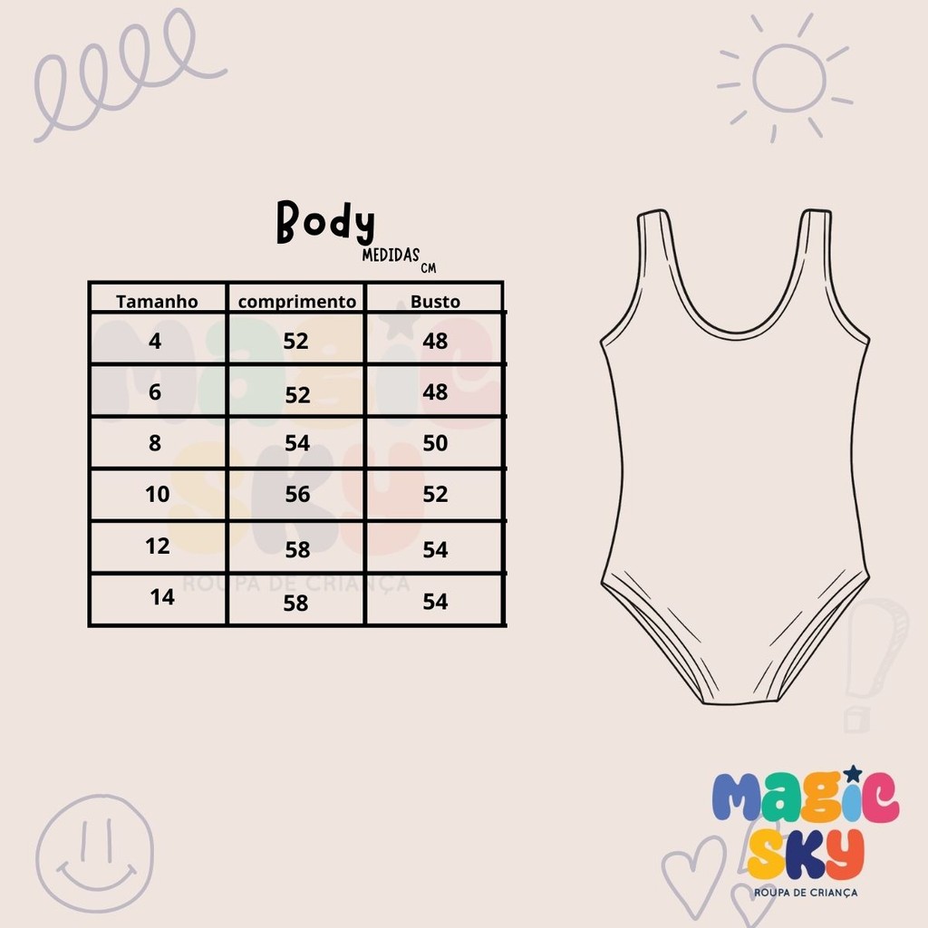 IMPORTANTE: Este anúncio é apenas do Body. A saia e os outros acessórios que aparecem na foto não estão inclusos. Collant Rosa das Princesas – Para sua pequena viver um conto de fadas! ?? Sua filha vive no mundo da imaginação e ama se vestir como uma princesa? Esse collant é o presente perfeito para deixar os dias dela ainda mais mágicos! Ele é ideal para aquela criança que não quer tirar a fantasia nem na hora de brincar. É uma peça prática, linda e que faz a gente se sentir em um verdadeiro castelo, seja para uma festinha de aniversário ou para as aventuras em casa. Por que as mamães (e as pequenas) adoram: Conforto para brincar: O tecido é macio e estica bastante, então ela pode correr, pular e se divertir à vontade, sem nada apertando ou incomodando. O Rosa que elas amam: Uma cor viva com o tema das Princesas que é puro encanto. Prático de verdade: É muito fácil de vestir e, na hora de lavar, seca rapidinho. Ótimo para quem quer usar a roupa favorita todo santo dia! ? Guia de Tamanhos (Simples e Direto) Para escolher o tamanho certo, a dica é medir uma roupinha que ela já usa e comparar aqui: Tamanho 4: Peito: 48 cm | Comprimento: 52 cm Tamanho 6: Peito: 48 cm | Comprimento: 52 cm Tamanho 8: Peito: 50 cm | Comprimento: 54 cm Tamanho 10: Peito: 52 cm | Comprimento: 56 cm Tamanho 12: Peito: 54 cm | Comprimento: 58 cm Tamanho 14: Peito: 54 cm | Comprimento: 58 cm