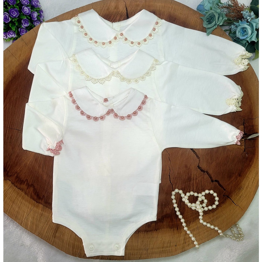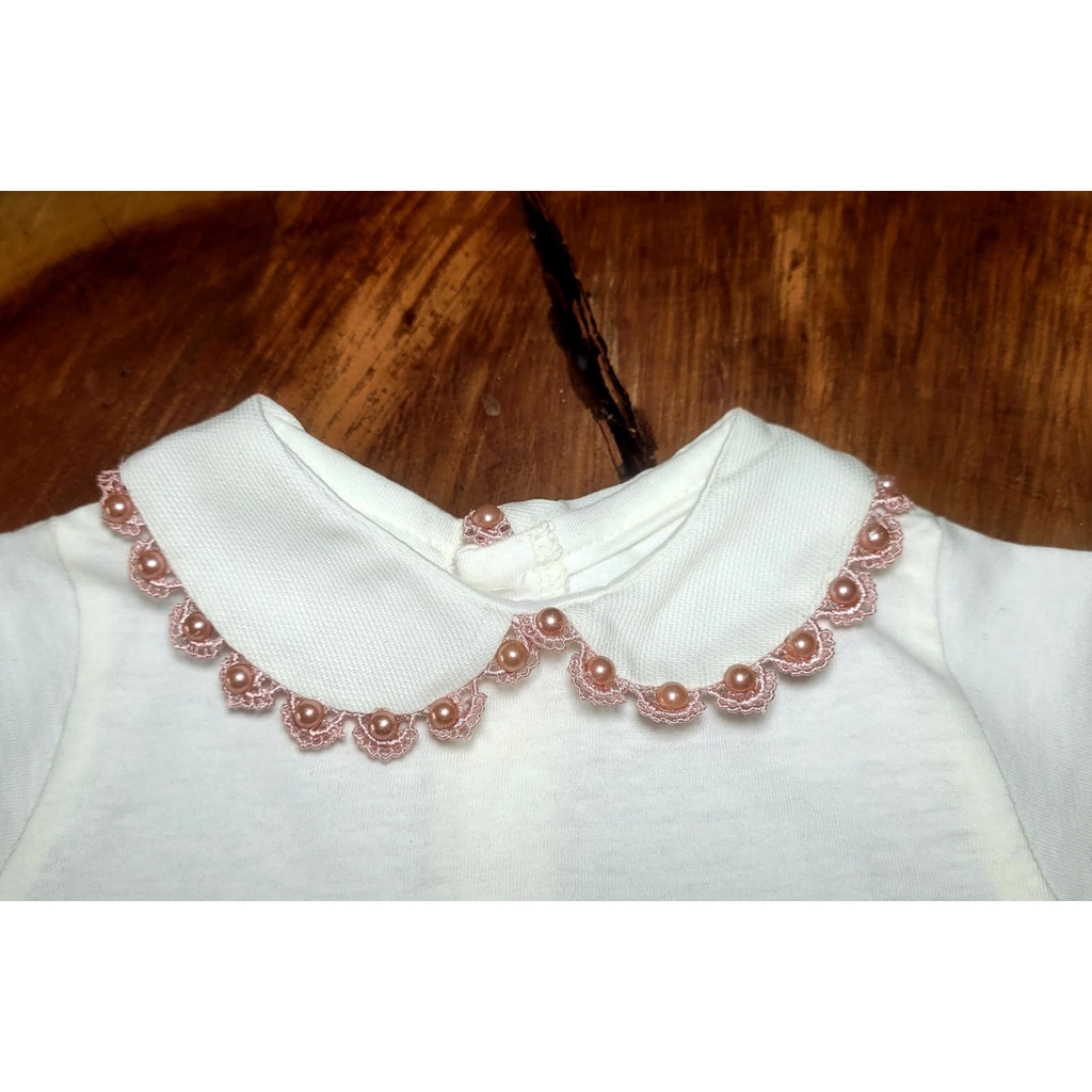 Body 100% algodão com gola e punho guipir com pérolas Cor: Off White Tamanho P Nossos bodies linha luxo são produtos com excelente acabamento e com detalhes finos e elegantes, que diferem nossos bodies dos produzidos em escala, seu acabamento e detalhes finos garantem a singularidade e elegância para os primeiros dias do seu bebê
