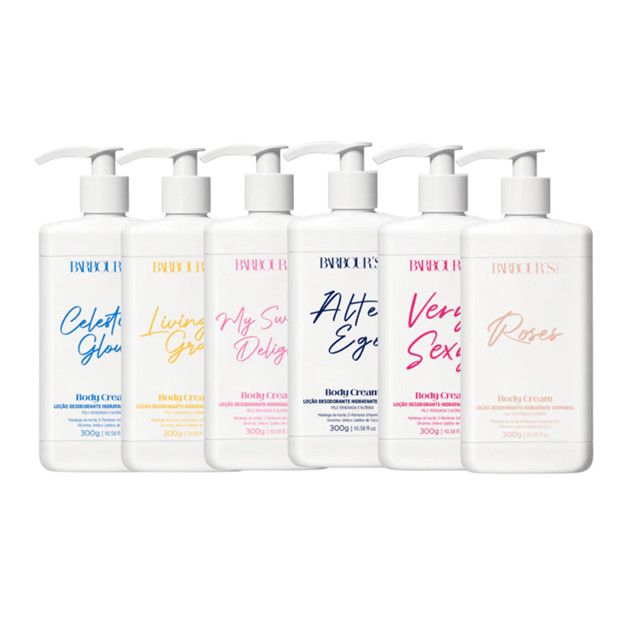 LOÇÃO DESODORANTE HIDRATANTE CORPORAL 300G BARBOURS O Body Cream utiliza uma combinação de tecnologias avançadas em hidratação e regeneração da pele: Manteiga de Karité: Oferece uma hidratação intensa, ajudando a restaurar a elasticidade da pele e protegê-la contra o ressecamento. D-Pantenol (Vitamina B5): Ativo conhecido por suas propriedades regeneradoras, auxiliando na reparação e cicatrização da pele, além de prevenir a desidratação. Glicerina e Ureia: São agentes que atraem e retêm a umidade na pele, garantindo uma hidratação profunda e duradoura, mantendo a pele macia e com uma textura sedosa. Lipídios de Coco: Formam uma barreira protetora que impede a perda de água, nutrindo e revitalizando a pele ao longo do dia. Esses ativos combinados proporcionam uma fórmula que restaura e protege a pele de forma eficaz, deixando-a macia e saudável. Benefícios Hidratação Intensa: Com manteiga de karité e lipídios de coco, sua pele permanece macia e nutrida o dia todo. Pele Saudável e Regenerada: O D-pantenol (vitamina B5) ajuda na regeneração da pele, prevenindo o ressecamento. Textura Sedosa: A glicerina e a ureia garantem uma pele com toque suave e sedoso, ideal para todos os tipos de pele. Perfume Suave: Proporciona uma fragrância delicada e agradável, perfeita para o dia a dia. Modo de usar: Aplique o Body Cream sobre a pele limpa e seca de todo o corpo, massageando suavemente com movimentos circulares até a completa absorção. Concentre-se nas áreas mais ressecadas, como cotovelos, joelhos e calcanhares. Para melhores resultados, utilize diariamente, após o banho ou sempre que sentir necessidade de hidratação. Roses - O Body Cream Roses Loção Desodorante Hidratante Corporal traz uma fragrância floral suave que envolve a pele enquanto a manteiga de karité e o D-Pantenol oferecem uma hidratação profunda. As notas de topo são: Champanhe Rosé e Pimenta Rosa. As notas de coração são: Flor de Pêssego e Rosa. As notas de fundo são: Almíscar Branco e Notas Amadeiradas. Very Sexy - O Body Cream Very Sexy Loção Desodorante Hidratante Corporal oferece hidratação profunda com uma fragrância irresistível, deixando sua pele macia, perfumada e com um brilho sedutor. As notas de topo são: Pera, Melão, Magnólia, Pêssego, Mandarina e Bergamota. As notas de coração são: Jasmim, Lírio-do-Vale, Tuberosa, Frésia, Rosa, Orquídea, Ameixa e Violeta. As notas de fundo são: Almíscar, Baunilha, Cedro e Amora. Celestial Glow - O Body Cream Angelical é perfeito para quem deseja uma pele macia e perfumada, combinando hidratação intensa com uma fragrância sedutora. As notas de topo são: Algodão-Doce, Coco, Cassis, Melão, Jasmim, Bergamota, Abacaxi e Mandarina. As notas de coração são: Mel, Bagas Vermelhas, Amora, Ameixa, Damasco, Pêssego, Jasmim, Noz-moscada, Alcarávia, Orquídea, Rosa e Lírio-do-Vale. As notas de fundo são: Patchouli, Chocolate, Caramelo, Baunilha, Fava Tonka, Âmbar, Almíscar e Sândalo. Living Grace - O Body Cream La Vie Loção Desodorante Hidratante Corporal oferece uma hidratação delicada e duradoura, com uma textura suave que nutre a pele e proporciona maciez o dia inteiro. As notas de topo são: Groselha Preta e Pera. As notas de coração são: Íris, Jasmim e Flor de Laranjeira. As notas de fundo são: Pralinê, Baunilha, Patchouli e Fava Tonka. My sweet Delight - O Body Cream My Sweet Delight Loção Desodorante Hidratante Corporal combina hidratação profunda com uma fragrância irresistível, deixando sua pele sedosa e perfumada. As notas de topo são: Lichia, Ruibarbo, Bergamota e Noz-moscada. As notas de coração são: Rosa Turca, Peônia, Almíscar, Petalia e Baunilha. As notas de fundo são: Cashmeran, Incenso, Cedro e Vetiver do Haiti. Alter Ego - O Body Cream Alter Ego Loção Desodorante Hidratante Corporal oferece hidratação intensa com manteiga de karité e lipídios de coco, regenerando e nutrindo a pele profundamente, enquanto previne o ressecamento e deixa um toque suave. As notas de topo são: Amêndoa, Café, Bergamota e Limão. As notas de coração são: Tuberosa, Jasmim Sambac, Flor de Laranjeira, Raíz de Orris e Rosa Búlgara. As notas de fundo são: Fava Tonka, Cacau, Baunilha, Pralinê, Sândalo, Almíscar, Âmbar, Madeira de Cashmere, Canela, Patchouli e Cedro.