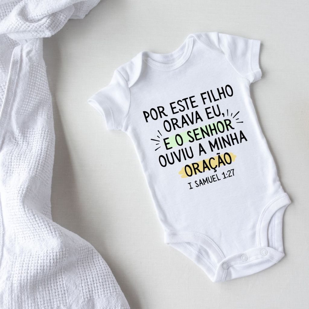 Body curto bebê branco divertido estampado frase revelação gravidez surpresa oração milagre