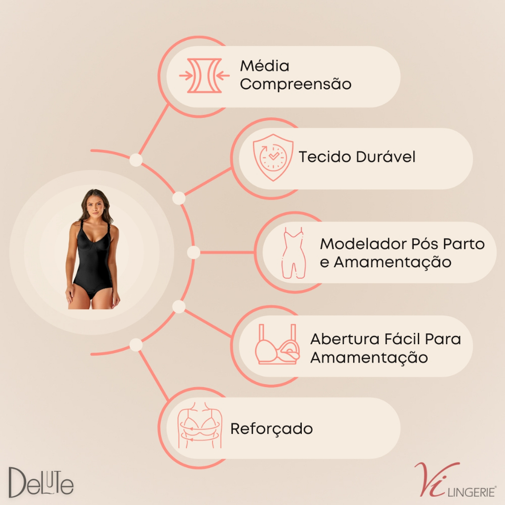 Confeccionado em cetinete estruturado, altamente compressivo, leve e macio. Busto anatômico, sem aro, com frente que se destaca por inteiro, com fechamento em fecho click plástico, facilitando a amamentação. Reforço estratégico em tecido duplo localizado na parte frontal da peca. Modela a cintura, comprime o abdômen e corrige a postura. Pernas cavadas com acabamento em elástico suave. Abertura no entrepernas com fechamento em colchetes de dupla regulagem. Costas retas, na altura do busto. Traseiro levemente cavado. Alças reguláveis. - Body modelador de silhueta sem bojo. - Ideal para mamães, possui abertura com fecho click para facilitar a amamentação. - Fecho entre as pernas com duas regulagens. - Body com compressão. - Bojo moldado: O bojo moldado e a parte onde delimita a área dos seios, nesse modelo de body sendo sem bojo de espuma e com costuras que envolvem e modelam os seios. Composicao: Poliamida: 77% Elastano: 23% \ Forro: Algodao: 100% Cores: Preto - Castanho (Marrom) - Chocolate (Creme)
