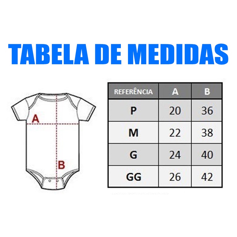 Nossos bodys encantadores e cheios de amor são perfeitos para adicionar um toque especial ao guarda-roupa do seu pequeno tesouro garantindo conforto e estilo. DESCRIÇÃO: Material: 100% Poliéster Cor: Branco Manga: Curta TAMANHOS (Largura X Comprimento) P = 20CM X 36CM (até 3 meses) M = 22CM X 38CM (de 3 a 6 meses) G = 24CM X 40CM (de 6 a 9 meses) GG = 26CM X 42CM (de 9 a 12 meses) Gostaria de outro modelo de estampa? Sem problemas! Basta nos chame agora pelo chat que vamos criar uma arte totalmente nova e sem custos! Muito obrigado!