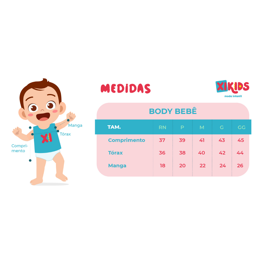 Uma pecinha nada básica para deixar o seu Bebê super Estiloso. O Body de Flanela Xadrez é Quentinho, macio ao toque, proporcionando Conforto e Bem-estar. Possui gola, ombros expansíveis e fechamento com botões de pressão, que facilitam o vestimento. Confeccionado em Tecido Flanela 100% Algodão. Somos Fabricantes de Moda Baby há mais de 32 anos e nossa Loja Física está localizada em Brusque, Santa Catarina. A Qualidade sempre foi a nossa prioridade. Com o nosso sistema de entrega Rápida e Segura, você tem 100% de satisfação na compra e garantia de devolução em caso de falha. Comprar online nunca foi tão fácil, aproveite! Instruções de Lavagem – Lavar à mão, preferencialmente com água morna. – Não usar alvejante. – Secar no varal. – Usar o ferro em temperatura mínima na hora de passar. Medidas do Body Tamanho RN - Idade 0 á 1 mês - Peso 3 á 4 kilos - Comp. 37 cm - Tórax 36 cm Manga 18 cm Tamanho P - Idade 1 á 3 meses - Peso 4 á 6 kilos - Comp. 39 cm - Tórax 38 cm Manga 20 cm Tamanho M - Idade 3 á 6 meses - Peso 6 á 8 kilos - Comp. 41 cm - Tórax 40 cm Manga 22 cm Tamanho G - Idade 6 á 9 meses - Peso 8 á 9 kilos - Comp. 43 cm - Tórax 42 cm Manga 24 cm Tamanho GG - Idade 9 á 12 meses - Peso 9 á 10 kilos - Comp. 45 cm - Tórax 44 cm Manga 26 cm