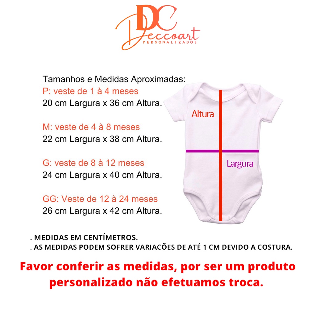 SEJA BEM VINDO !!! (SE DESEJA PERSONALIZAR O BODY, APÓS A COMPRA MANDE O NOME, FOTO, OU FRASE NO CHAT). Caso o cliente não responda as mensagens o body será enviado como a foto do anúncio ou sem NOME Especificações do Body: Tecido: Malha 100% Poliéster Técnica de Estamparia: Sublimação Estampa não deixa Relevo, Pois penetra diretamente nas fibras do tecido, Não desbota e não racha. Tamanho aprox. do Body: P: DE 1 A 3 MESES M: DE 3 A 7 MESES G: DE 7 A 10 MESES GG: DE 10 A 12 MESES *Acima de 12 meses temos camisetinha Personalizada* - Produção feita no dia da compra, Postagem em até 24h. - Utilize o quadro de medidas nas fotos do anúncio para escolher o tamanho desejado, não aceitamos troca ou devoluções a respeito do tamanho dos bodys, por isso já disponibilizamos as medidas reais no nosso quadro de medidas. - Mantenha seus dados atualizados para um possível contato caso necessite. - Caso queira modificar a estampa, mande sua ideia no chat. Dúvidas estamos à sua disposição! Agradecemos sua Visita, Ótimas compras!