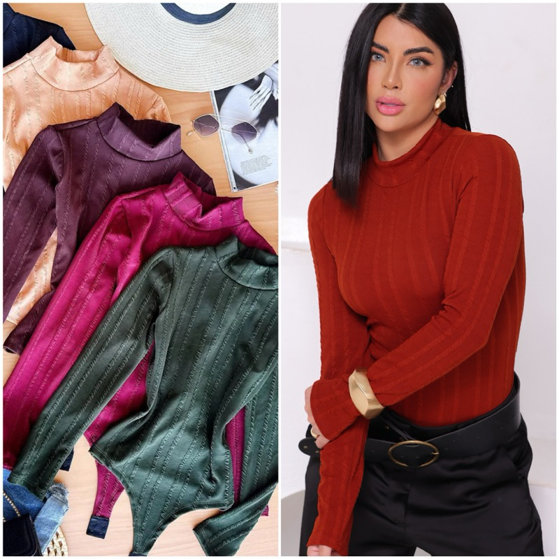 BODY FEMENINO MODA GRINGA BÁSICO E ESTILOSO TENDENCIA COM MANGA LONGA E GOLA ALTA RIVANA