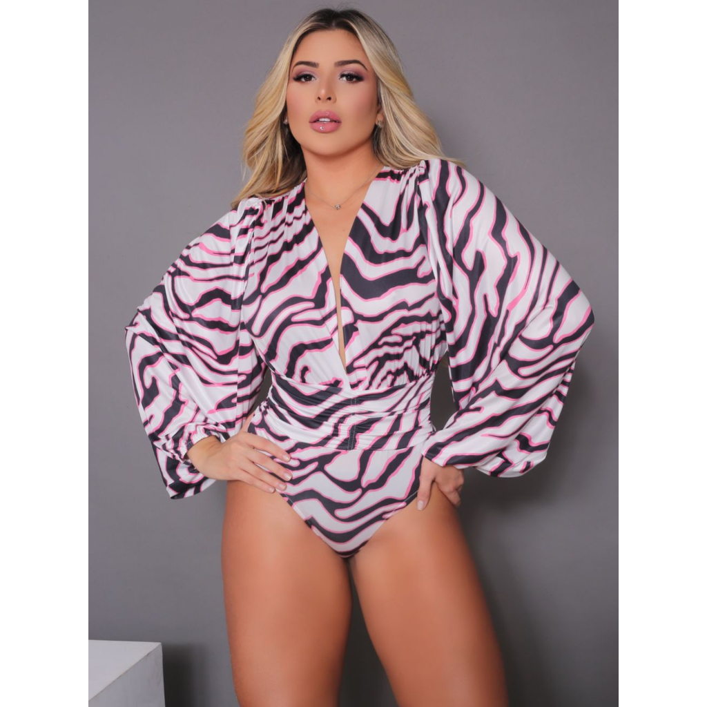 Body Feminino Manga Longa Bufante Estampado Transpassado Decotado Gola V Moda Blogueira