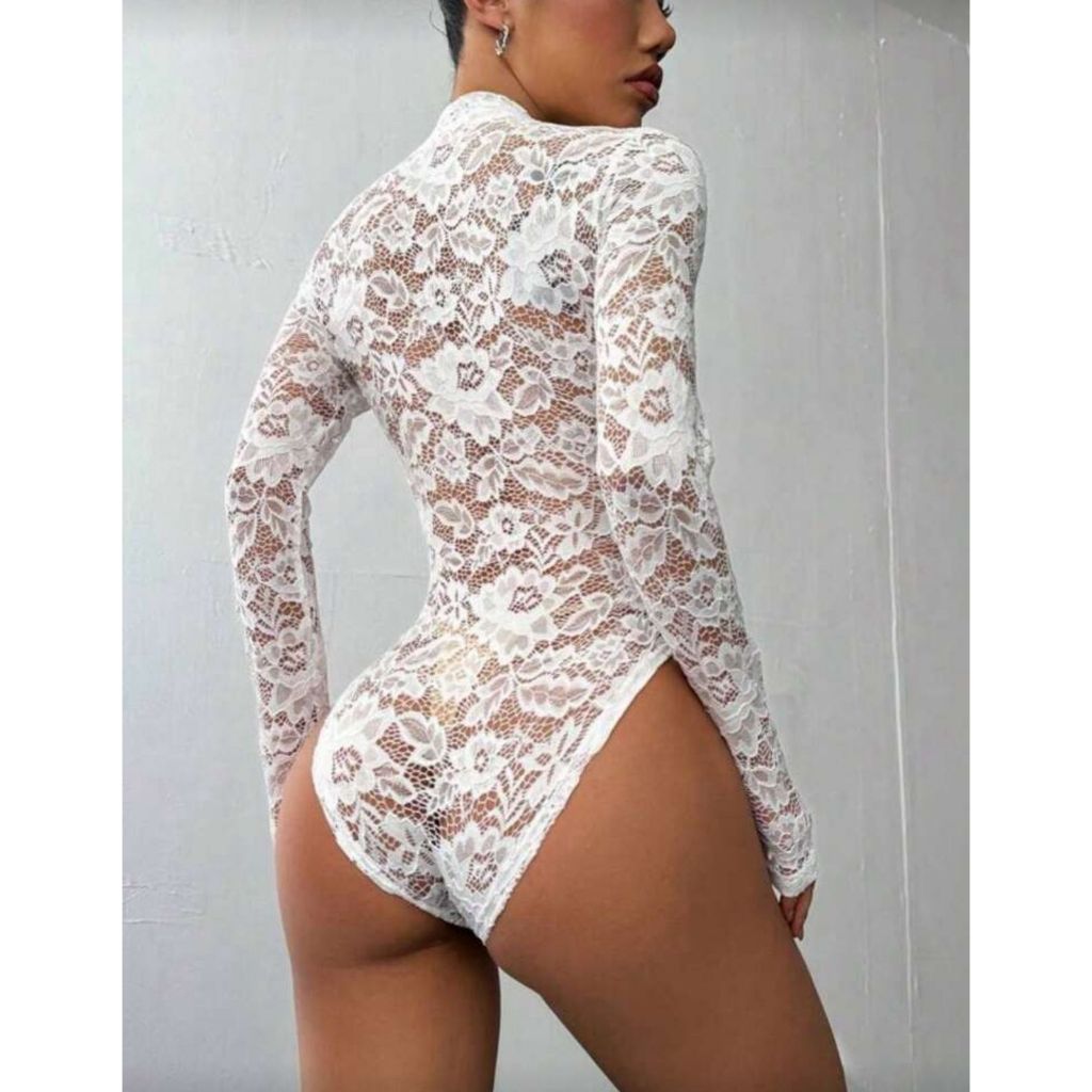 Body Feminino Renda Transparente Sexy Inverno Festa Look Noite Manga Longa
