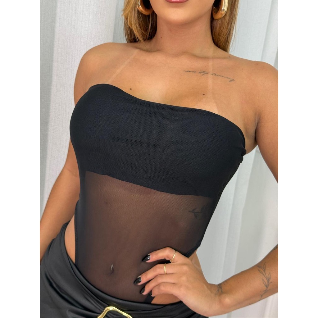 Body Feminino Tule Cavado Tomara que Caia com Bojo Forrado Blusa Feminina Moda Gringa Feminina