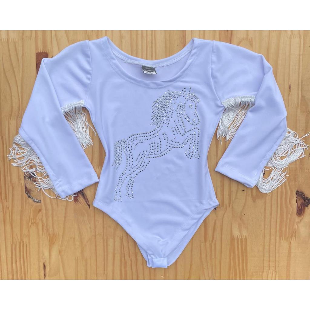 Body Infantil Manga Longa Franja Preto e Branco Pedraria Brilho Menina Country Cavalo Cowgirl Boiadeira