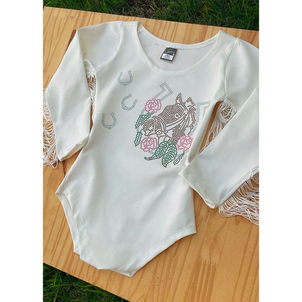 Body Infantil Menina Manga Longa Franja Strass Preto e Branco Pedraria Country Cowgirl Cavalo Ferradura Rodeio Diversos