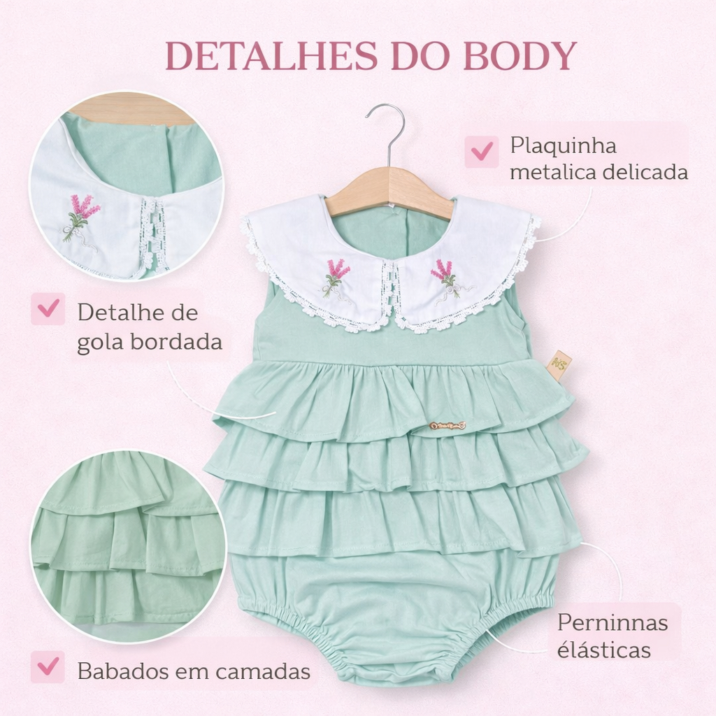 Body infantil para bebe bordado com gola e babados confortavel e charmoso bory para menina