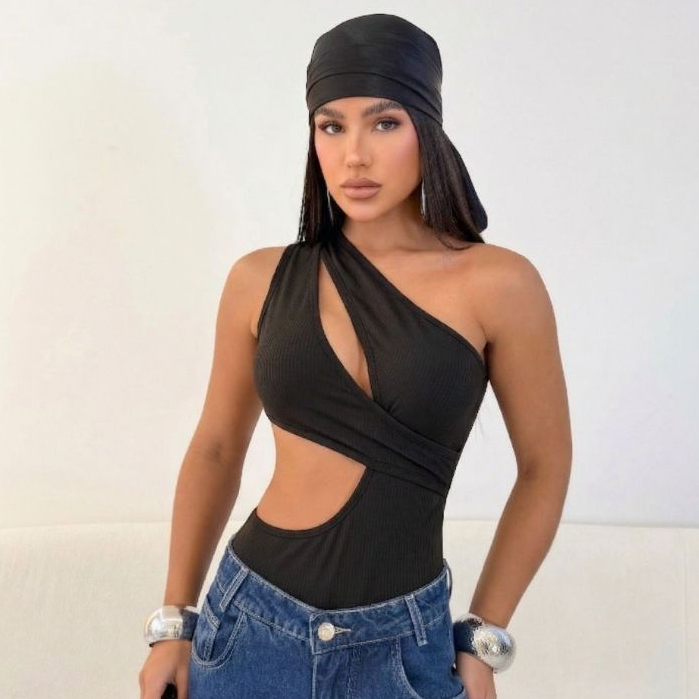 Body Lara Assimétrico em Malha Canelada com Recorte Lateral Sexy Moda Feminina Sem Bojo