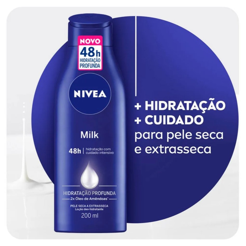 O que é e para que serve Nivea Milk Hidratação Profunda? A Loção Nivea Milk Hidratação Profunda é um hidratante corporal e um produto desenvolvido para hidratar profundamente a pele, proporcionando um cuidado intensivo. Sua textura cremosa e suave oferece uma agradável sensação de maciez, cuidando e protegendo a pele do ressecamento. NIVEA Loção Hidratante Milk pele seca a Extrasseca possui uma fórmula enriquecida com duas vezes mais óleo de amêndoas, nutre intensamente por até 72 horas. Indicado especialmente para peles secas e extrassecas, este hidratante corporal é livre de corantes, sem álcool etílico e não contém ingredientes de origem animal. Denso e com a clássica fragrância de NIVEA, deixa a pele visivelmente mais saudável e bonita. Principal ativo e como atua Óleo de Amêndoas: auxilia na hidratação, principalmente nas áreas mais ressecadas, como joelhos, cotovelos e pés, por apresentar propriedade umectante e emoliente que ajuda na retenção de água da pele, mantendo-a hidratada. O que é a loção deo hidratante Nivea beleza Radiante Cuidado Intenso? A loção deo hidratante Nivea Beleza Radiante Cuidado Intenso é um produto desenvolvido especialmente para a beleza da pele negra. Formulado com 5 óleos naturais e vitaminas, ele contém Abacate, Oliva, Soja, Macadâmia e Amêndoas e Vitaminas E, B3 e Pro Vit B5, ativos que ajudam a deixar a pele com um brilho natural e saudável. A loção Nivea Beleza Radiante está disponível em embalagem com 200ml. Para que serve a loção deo hidratante Nivea Beleza Radiante Cuidado Intenso? Indicado para pele seca a extrasseca, loção deo hidratante Nivea Beleza Radiante Cuidado Intenso oferece 48 horas de hidratação profunda, ajudando na reparação das áreas ressecadas e reduzindo as estrias em 2 semanas, além de aliviar a descamação da pele