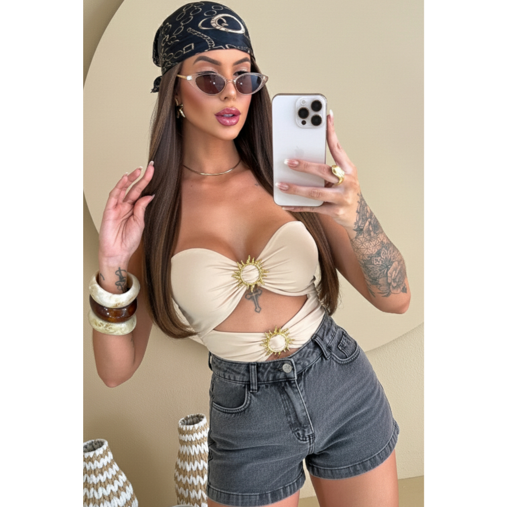 Body Maiô Tomara que Caia Luxo - Detalhes Sol Dourado Fivela e Com Bojo Detalhe Barriga
