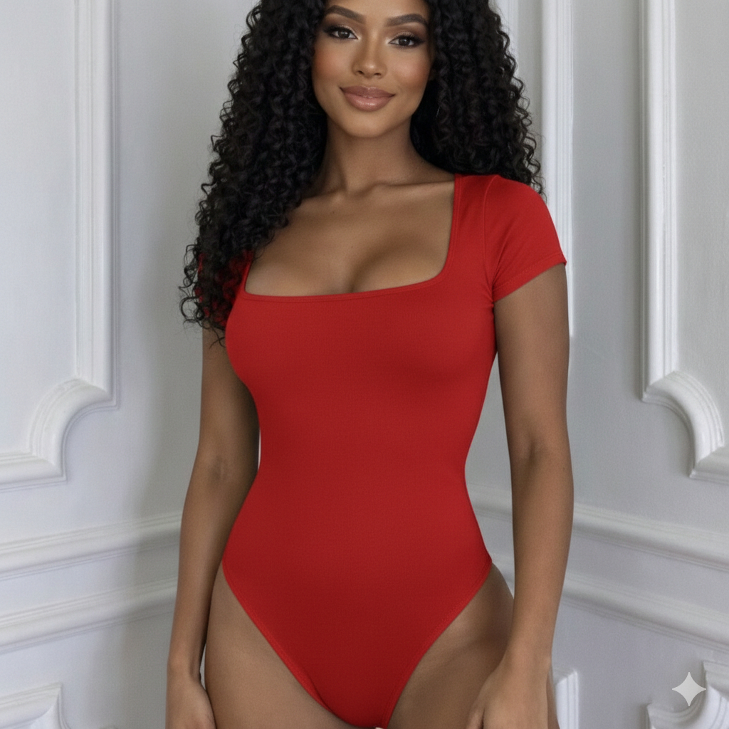Body Manga Curta Feminino Decote Quadrado Forro Duplo Suplex Moda Verão Tendência